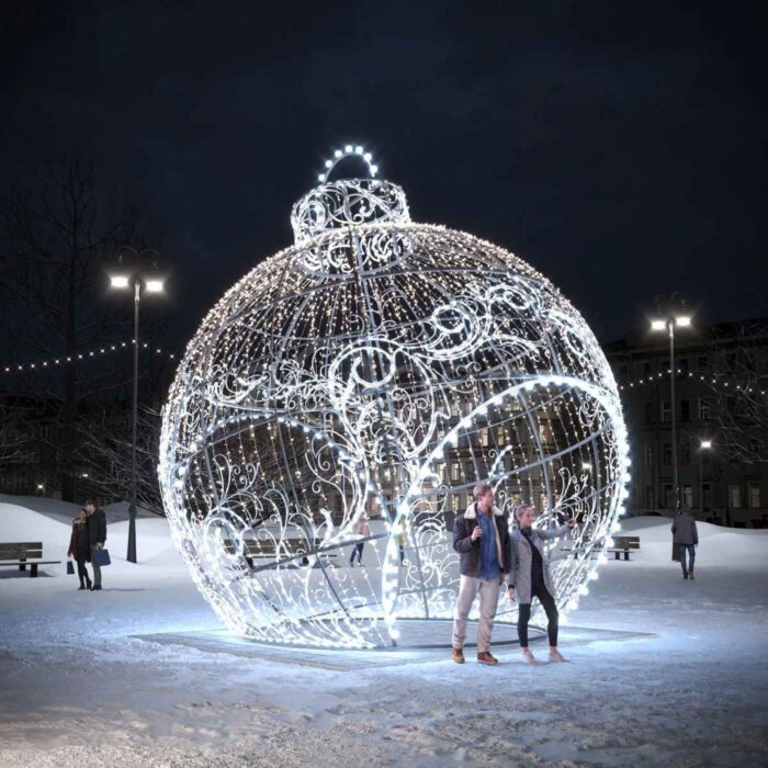 Световая инсталляция «Шар с морозными узорами» — это крупная объёмная 3D-фигура с архитектурной выразительностью, созданная для оформления праздничных пространств в городах, торговых центрах, на площадях, возле культурных учреждений и в парках. Эта фигура особенно популярна в период новогодних и зимних праздников, когда уличная среда требует акцента, создающего атмосферу волшебства, света и уюта.