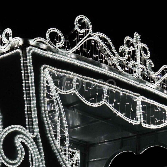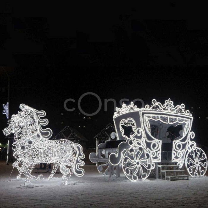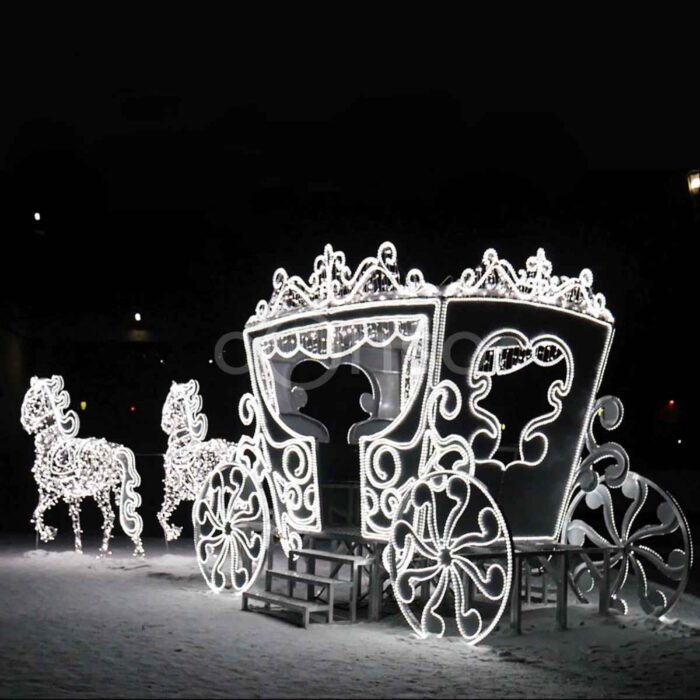 Объёмная 3D-фигура «Карета с лошадьми» — эффектная новогодняя фотозона для улиц, ТЦ, парков и городских пространств. Размер: до 5 м. Каркас — алюминий, холодное свечение. Поставляется с подключением. Устойчивость к морозам и влаге. Доступна со склада или под заказ. Производим, доставляем и монтируем под ключ.