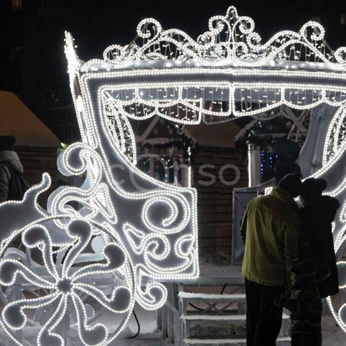 Эффектная световая композиция «Карета с лошадьми» — это настоящая сказка в реальности. Фигура создана в формате масштабной уличной фотозоны и представляет собой каркасную 3D-конструкцию в виде праздничной кареты и двух лошадей. Такое оформление неизменно вызывает восторг у детей и взрослых, становится центром притяжения внимания и главным фоном для новогодних фотографий.