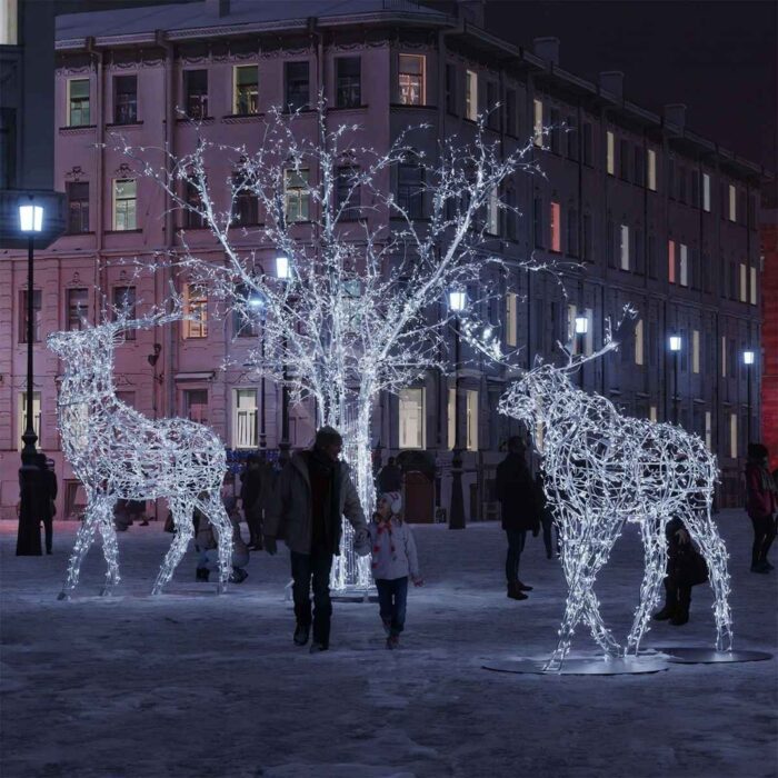 Светодиодная композиция из трёх уличных фигур: дерева, лося и оленя. Эффектное решение для праздничного оформления парков, площадей, входных групп и ТЦ. Каркас — металл с порошковой покраской, надёжная влагозащита IP65. Подходит для круглосуточной эксплуатации на улице даже в морозы до –50 °C.