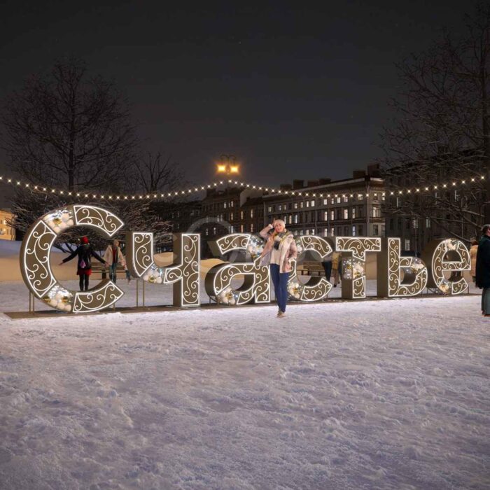 Инсталляция выполнена в форме слова «Счастье» — символичной, доброй и универсальной фразы, которая работает на всех уровнях восприятия: визуальном, эмоциональном и социальном. Это идеальное решение для оформления новогодних и зимних пространств, Дней города, праздничных событий, фотозон и тематических аллей.