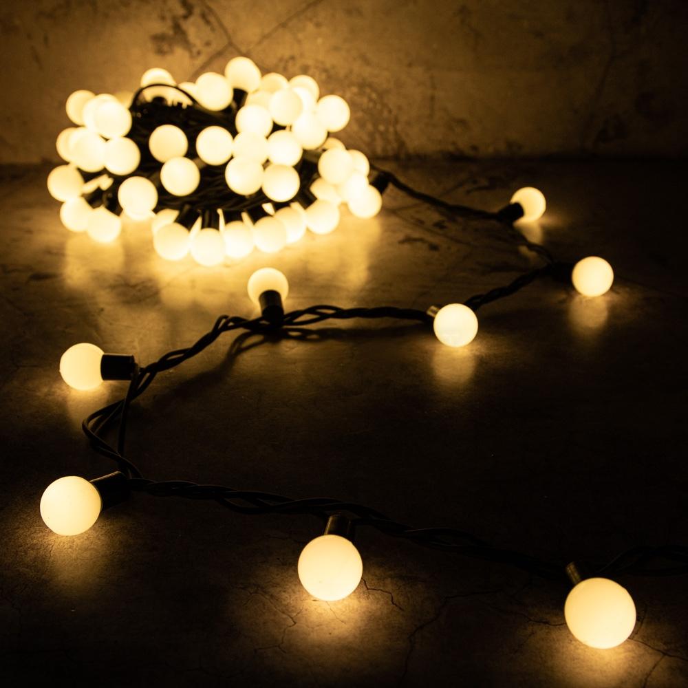 Диаметр каждого шарика — 2,5 см. Свет получается объёмным, мягким и заметным даже на большом расстоянии. Его видно и днём, и ночью.