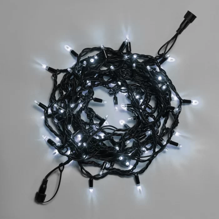 Профессиональная уличная гирлянда нить 10 м с белым ровным свечением. Провод — усиленный чёрный каучук 3.3 мм. Защита IP65, 100 LED, напряжение 220 В. Выдерживает мороз до –40 °C. Серия PREMIUM PRO.