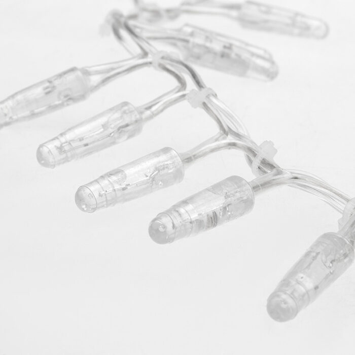 Гирлянда кластерного типа с белым ровным свечением. 400 LED на 10 метрах, прозрачный провод, защита IP65. Отлично подходит для фасадов, заборов, деревьев и колонн. Эстетичное уличное освещение с минимальной видимостью провода.