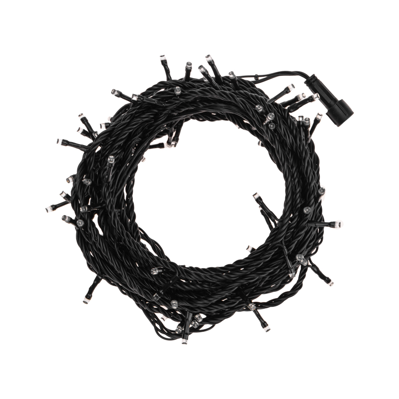 Провод изготовлен из чёрного ПВХ диаметром 2.3 мм — это гибкий, влагостойкий и устойчивый к морозу материал. Гирлянда защищена по стандарту IP65, что позволяет использовать её на улице при дожде, снеге, ветре и температуре от −25 до +40 °C.