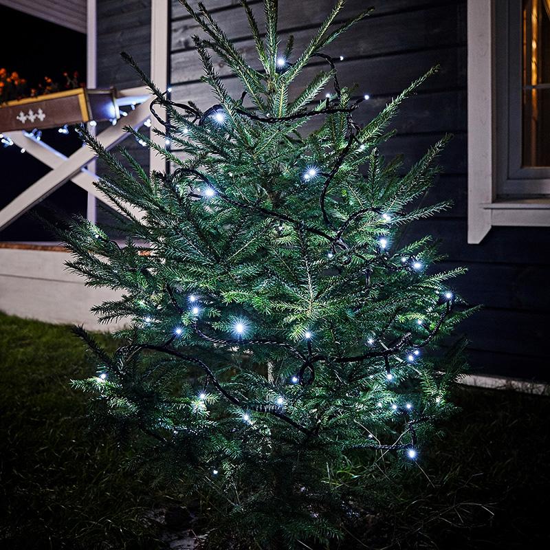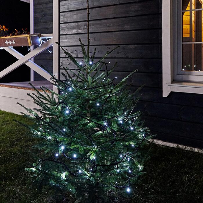 Белая гирлянда длиной 10 метров с динамическим свечением и 8 режимами. Подходит для улицы и украшения фасадов, деревьев, колонн и перил. Защита IP65, надёжный чёрный ПВХ-провод, питание от сети 230 В.