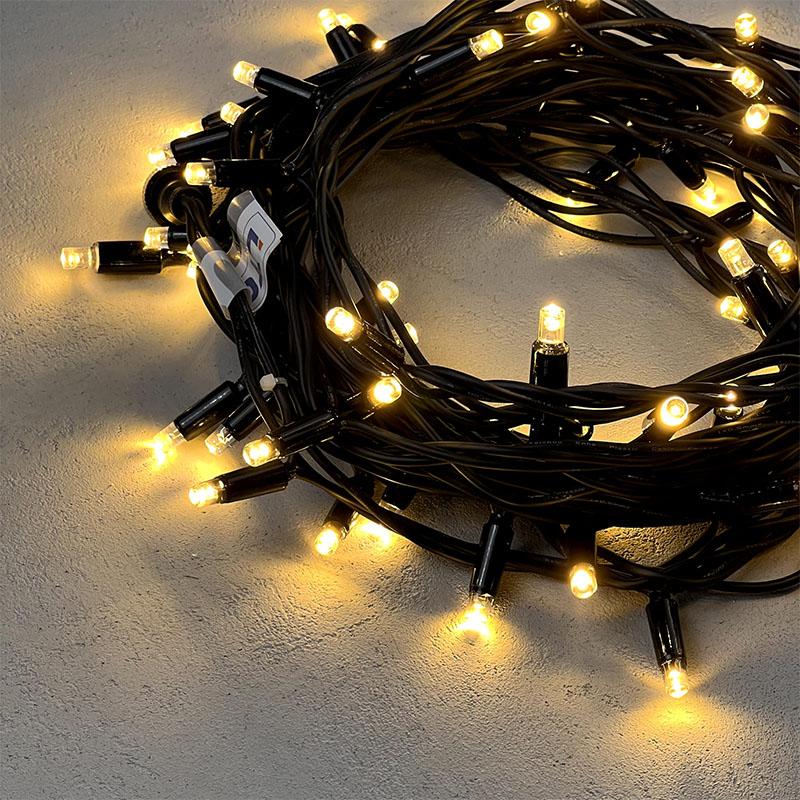 Гирлянда длиной 10 метров с тёплым белым светом и прочным чёрным проводом из каучука. IP65, 75 светодиодов, подключение 220 В. Подходит для уличной подсветки в любую погоду. Для фасадов, деревьев и навесов.