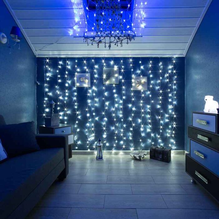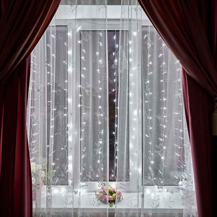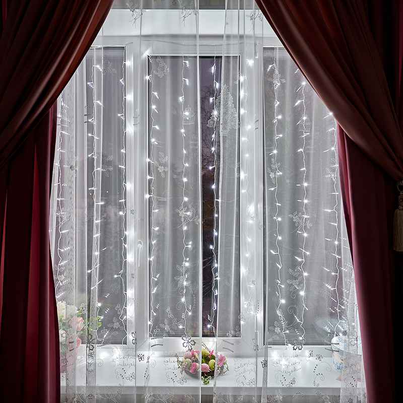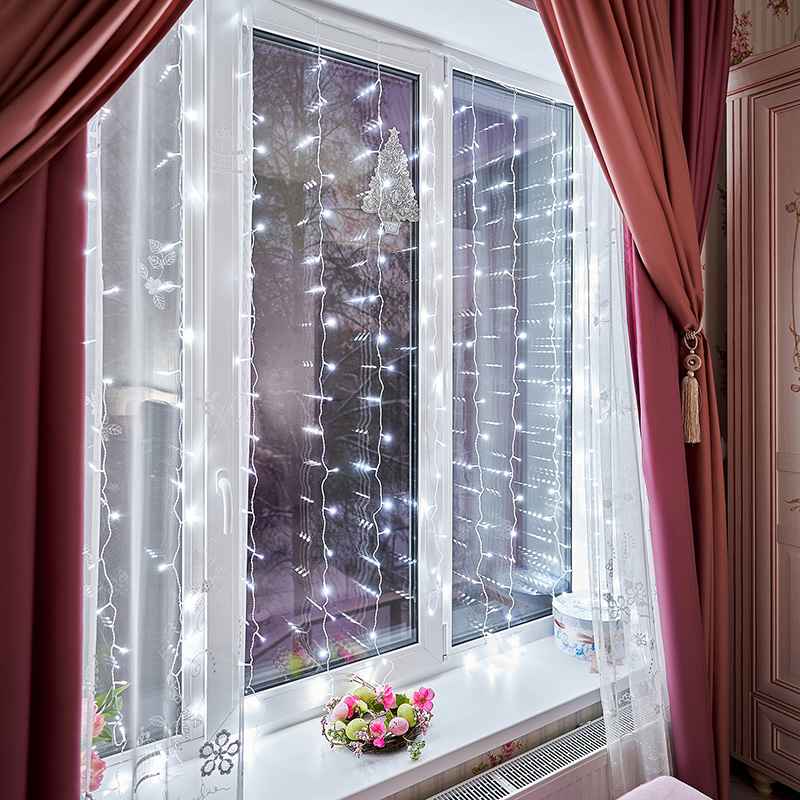 Гирлянда-занавес размером 2.5×2 м помогает быстро украсить большую поверхность: окно, стену, арку или зону для фотографий. 300 ярких светодиодов делают помещение заметно уютнее и светлее.