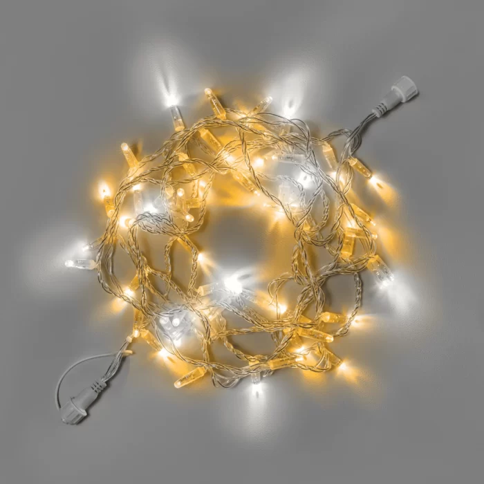 Модель состоит из двух симметричных участков по 5 метров, что позволяет удобно размещать гирлянду на углах, изгибах, по фасадам, колоннам и деревьям. Прозрачный ПВХ-провод 2.3 мм делает её почти незаметной днём — идеальное решение для тех, кто ценит эстетику.