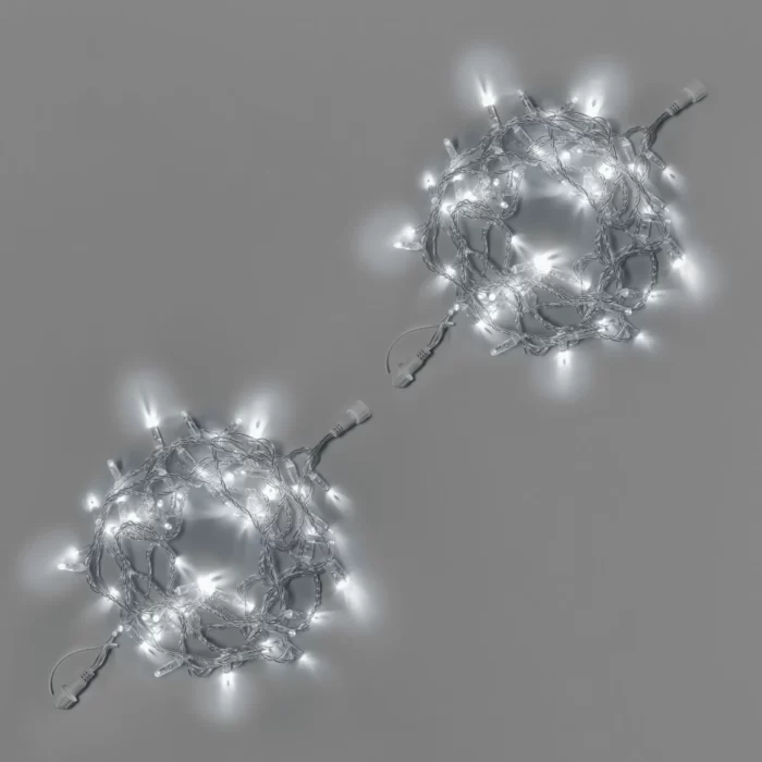 Гирлянда состоит из двух отрезков по 5 метров с соединением посередине. Это удобно при обходе углов, подсветке окон или симметричных конструкций. 100 диодов равномерно распределены по всей длине — без световых пробелов и “тёмных зон”.