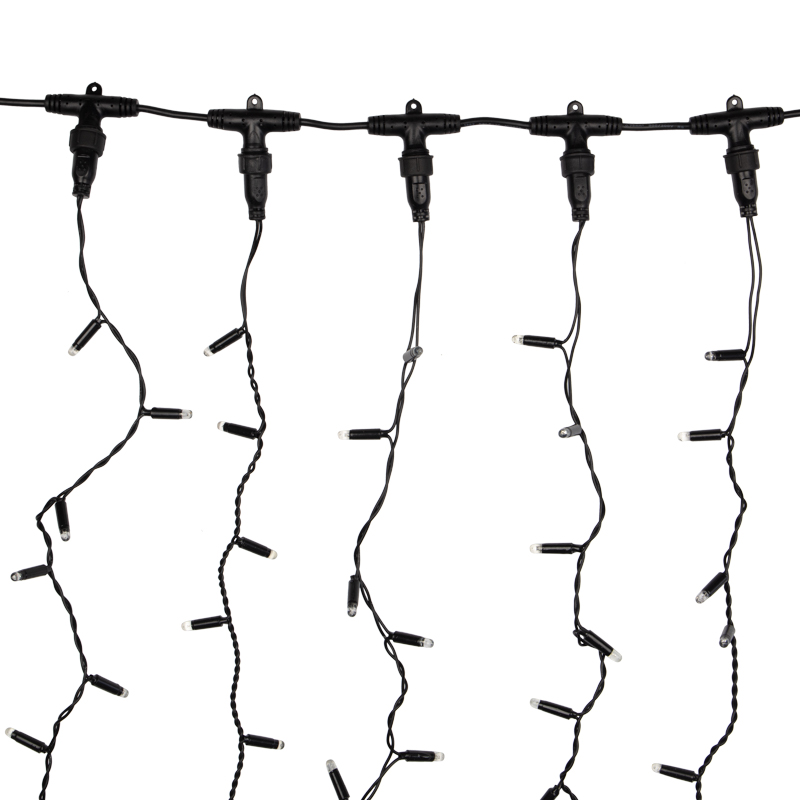 Профессиональная гирлянда-занавес 2×3 м с белым свечением и эффектом мерцания создаёт эффектное праздничное оформление. 600 ярких LED, влагозащита IP65 и морозостойкость до –25°C позволяют использовать её на улице и в помещении. Чёрный ПВХ-провод гармонично смотрится на тёмных фасадах и деревьях. Возможность соединения до 3 гирлянд делает её удобной для масштабных проектов.