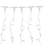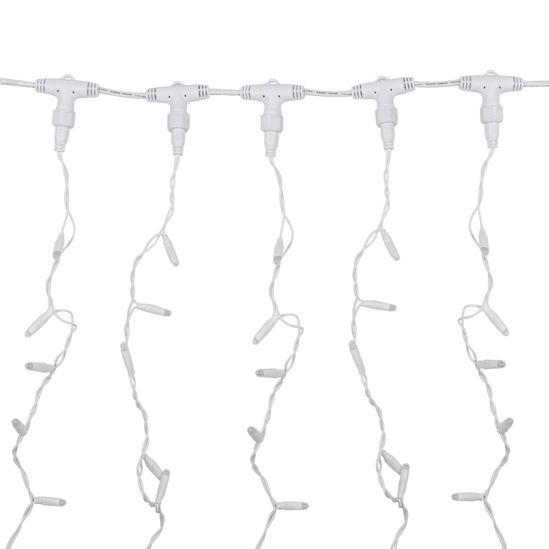 768 светодиодов распределены по 16 нитям, что обеспечивает плотный световой поток без «пустот» и равномерное свечение по всей высоте. Такой занавес подойдёт и для фасадов, и для оформления входных групп, и для праздничного декора зелёных насаждений.