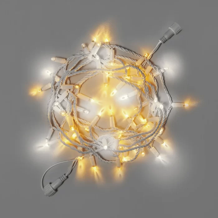 Провод выполнен из морозостойкого каучука 2.3 мм. Белый цвет идеально подходит для светлых фасадов и зимних композиций — он практически незаметен днём и подчёркивает аккуратность монтажа.