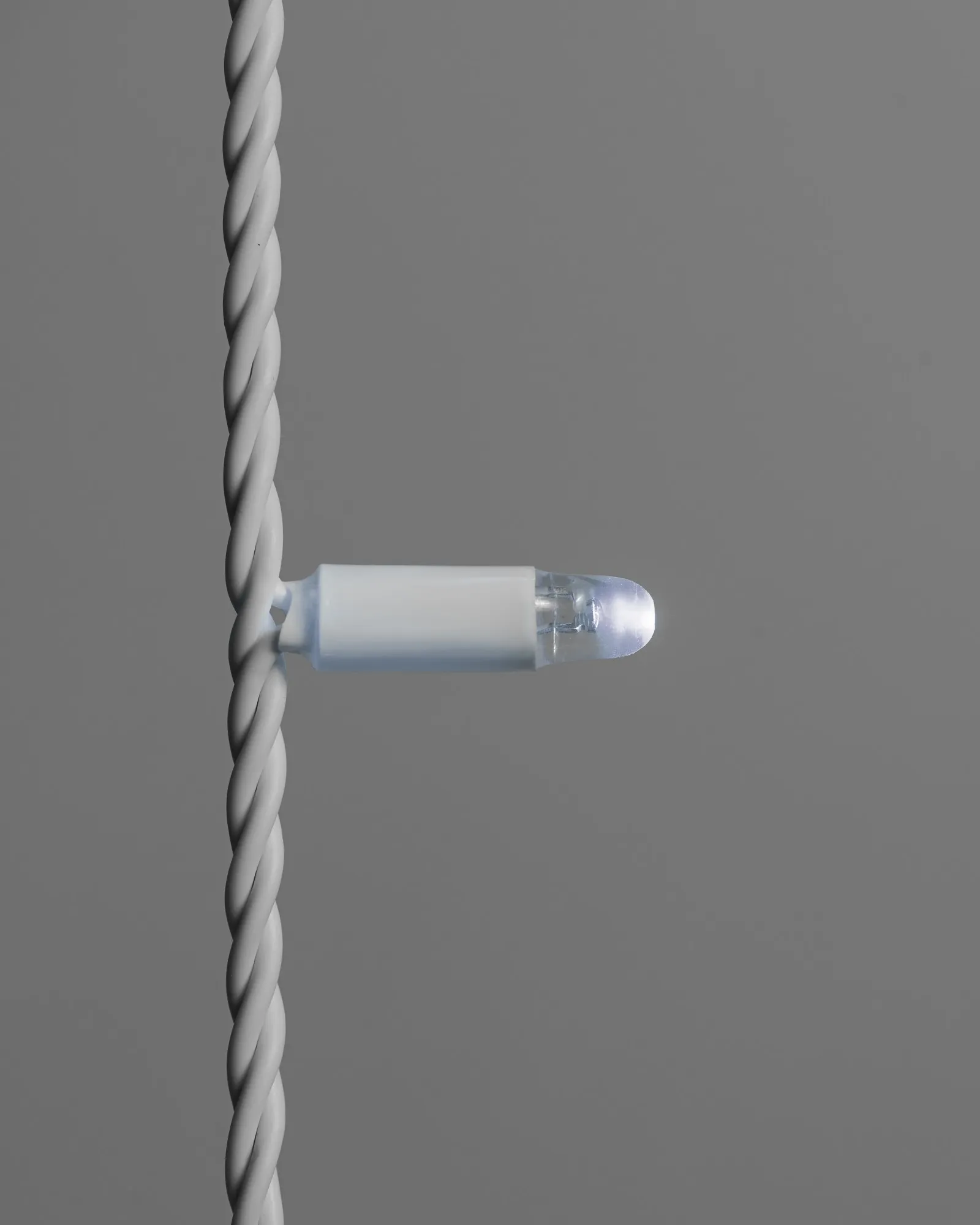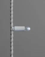 Провод — белый, каучуковый, толщиной 3,3 мм. Он незаметен на светлом фасаде и выдерживает морозы до –40 °C. Это важно: зимой провод не дубеет, не трескается и не тянется. Он не боится снега, дождя, солнца и перепадов температуры. Уровень влагозащиты — IP65. Надёжность такая, что гирлянду можно оставить на доме круглый год.