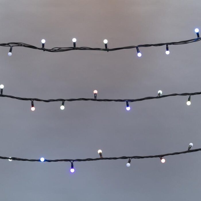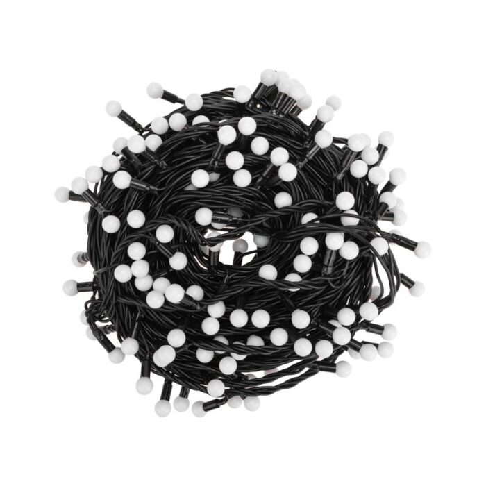 Яркая гирлянда с миниатюрными RGB-шариками (13 мм) и эффектом быстрой смены цвета. Длина 20 м, 200 светодиодов, защита IP65. Подходит для улицы: деревья, заборы, перила, колонны. Один динамический режим. Питание 230 В.