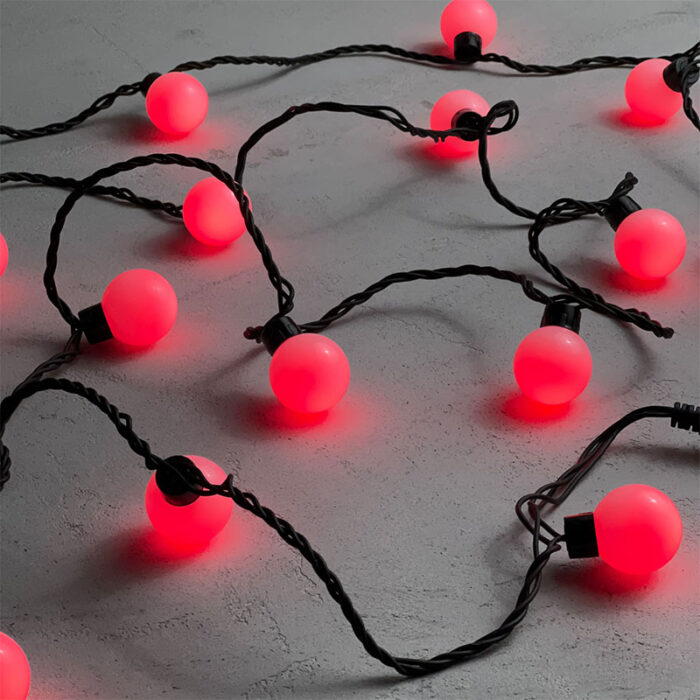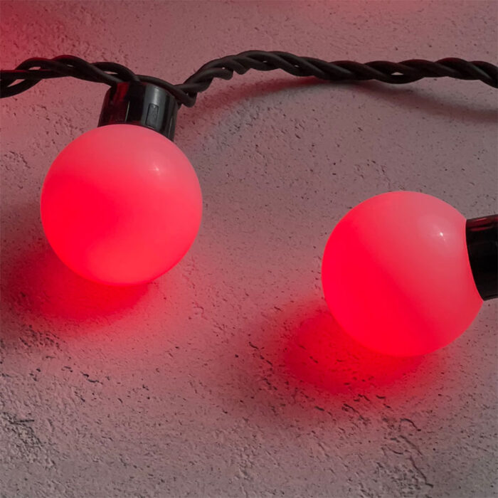 Яркая гирлянда с крупными красными шариками диаметром 40 мм. Защита IP65 и прочный чёрный каучук делают её идеальной для улицы. Подключение уже в комплекте — просто включите и наслаждайтесь светом.