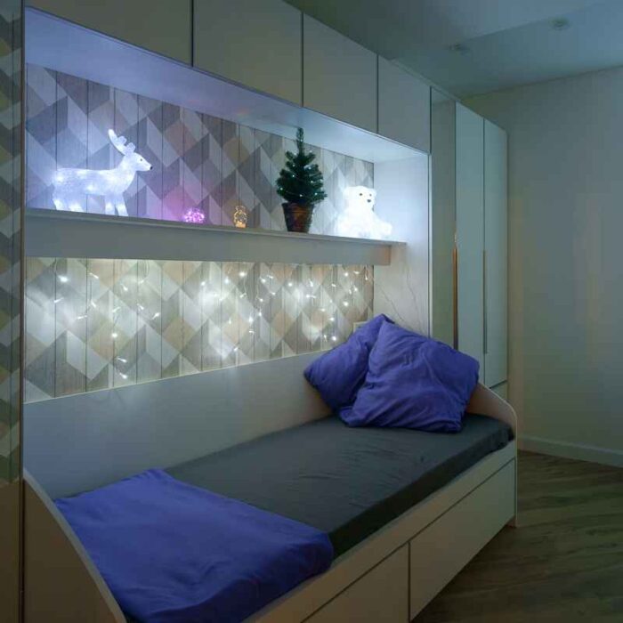 Эта гирлянда универсальна и при этом ненавязчива. Белый свет — символ чистоты и порядка, а динамика добавляет лёгкий эффект вау.