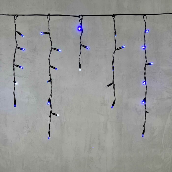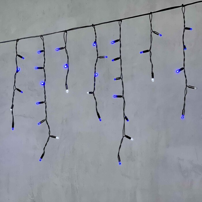 Синяя гирлянда-бахрома с белым мерцанием. Длина 3,1 м, 120 LED. Чёткий холодный свет, эффект капель, надёжная защита IP65.