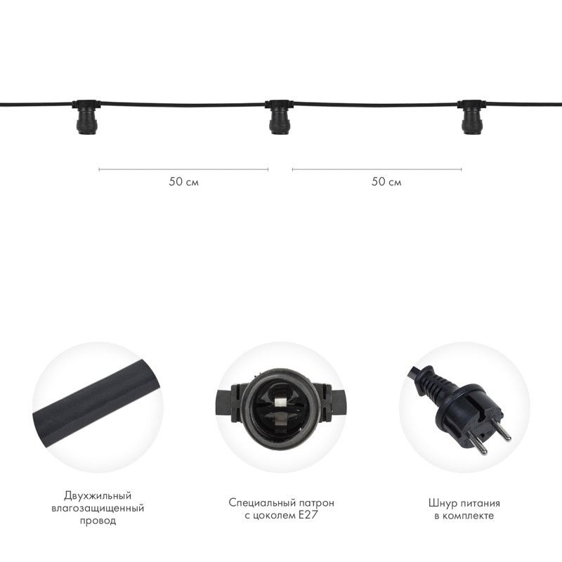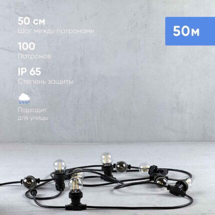 Белт-Лайт 100м, Провод Черный ПВХ, Шаг 50 см, 180 Патронов, E27, IP65