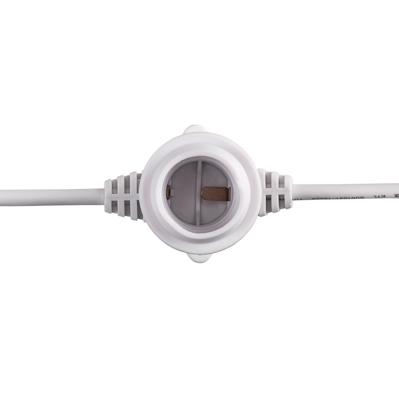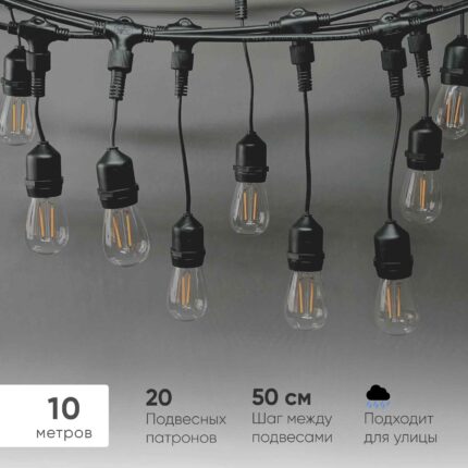 Гирлянда выполнена в виде устойчивого к морозам двухжильного резинового ПВХ-кабеля с патронами под лампы с цоколем Е27. Кабель имеет круглую форму и отличается небольшим весом. Каждый патрон снабжен специальным уплотнителем, обеспечивающим уровень защиты IP65 вне зависимости от положения лампы.