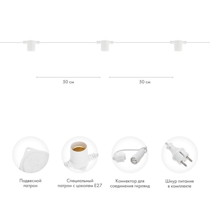 10-метровый кабель оснащен 20 патронами с цоколем E27, размещенными через каждые 50 см. Для подключения к электросети предусмотрен трехметровый провод с европейской вилкой. Удобство эксплуатации обеспечивает возможность последовательного соединения до четырех комплектов гирлянды.