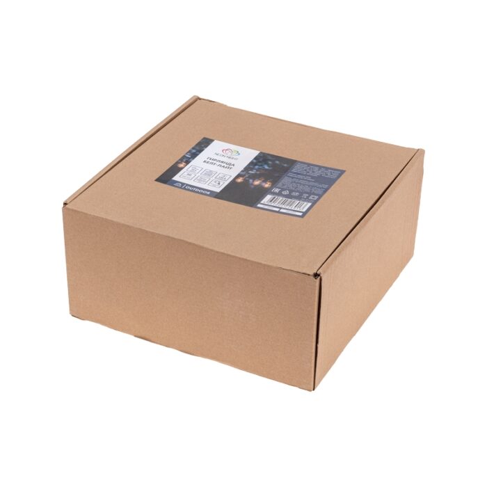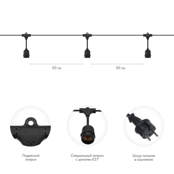 10-метровый кабель оснащен 20 патронами с цоколем E27, размещенными через каждые 50 см. Для подключения к электросети предусмотрен трехметровый провод с европейской вилкой. Удобство эксплуатации обеспечивает возможность последовательного соединения до четырех комплектов гирлянды.