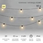 Уличная гирлянда «Лофт» – это готовое решение на базе гирлянды «Белт-Лайт», включающее в себя 20 прозрачных светодиодных ламп, уже вкрученных в патроны. Каждая лампа содержит 5 светодиодов.