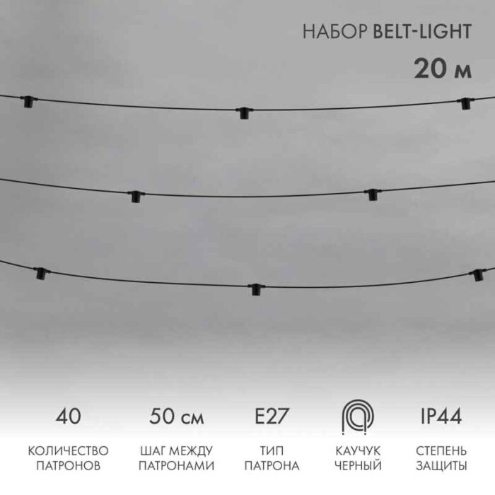 Белт-Лайт Лофт 20м, Провод Черный Каучук, Шаг 50 см, 40 Патронов, IP44