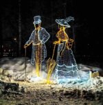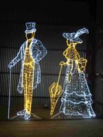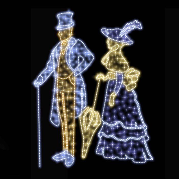 Световая фигура «Дама и Кавалер» — элегантная уличная композиция для украшения площадей, парков, входных групп и фотозон. Каркас выполнен из стали с антикоррозийным покрытием, освещение — тёплый белый светодиод. Фигура защищена по стандарту IP54 и устойчива к морозам до –50 °C. Доступна в разных размерах от 1,8 до 4 м.