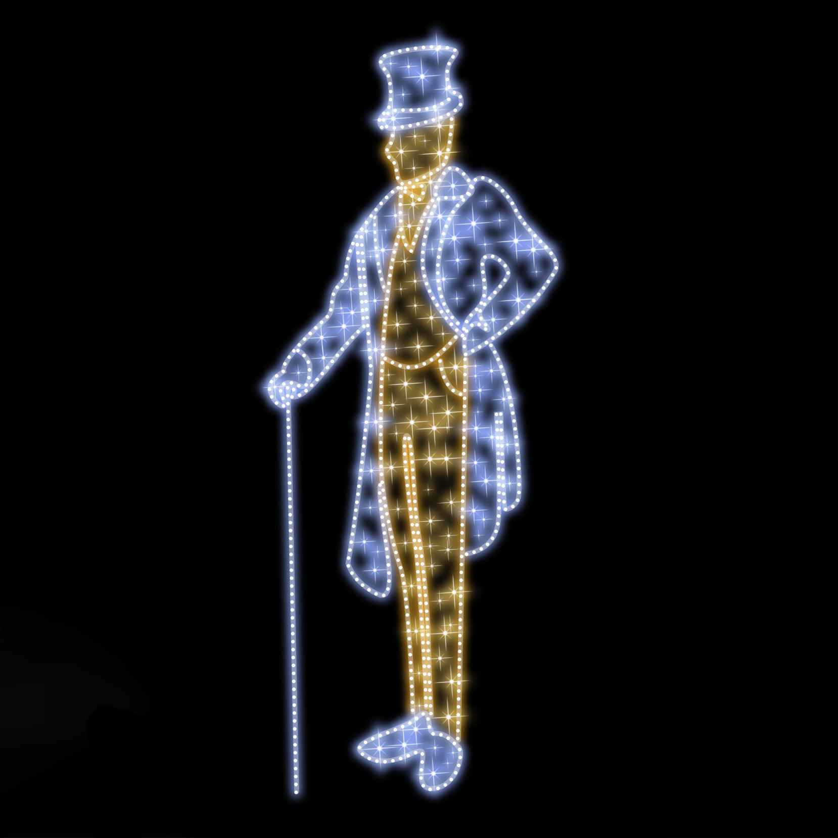 Эта фигура сочетает в себе классику и современность: узнаваемый силуэт в традиционном стиле и новейшие технологии светодиодного освещения. Тёплый белый свет придаёт композиции особую мягкость и уют, создавая ощущение сказочного вечера и приглашая гостей к совместным фотографиям.
