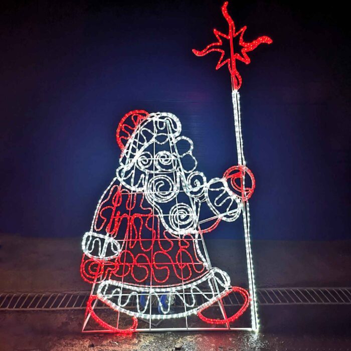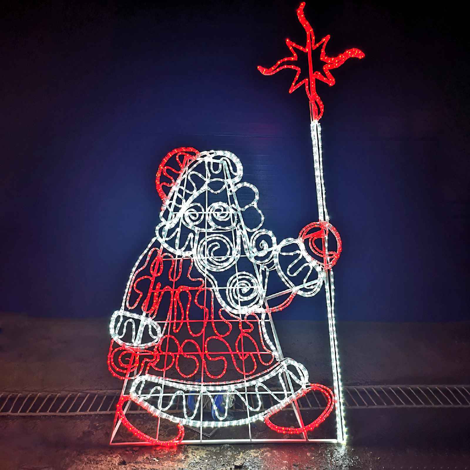 Световая фигура «Дед Мороз кружевной» — это элегантное решение для новогоднего оформления улиц, входных групп, фасадов и открытых пространств. Изящная конструкция в ажурном стиле напоминает старинные новогодние открытки и создаёт атмосферу волшебства, праздника и ностальгии. Такой Дед Мороз сразу притягивает взгляд и вызывает тёплые эмоции — как у детей, так и у взрослых.