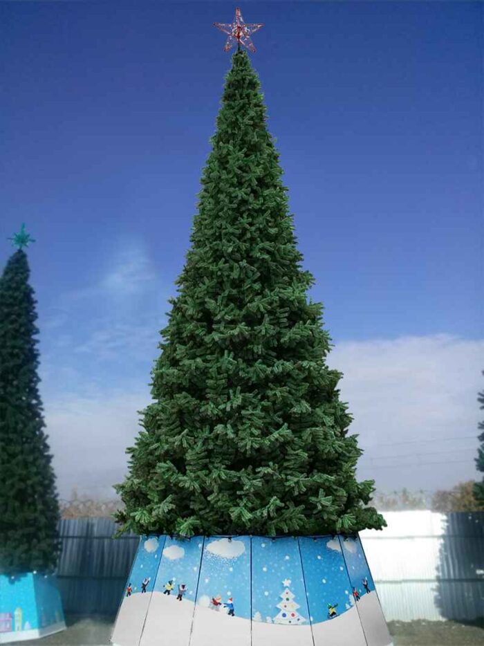 Уличная новогодняя искусственная елка представляет собой сборную металлическую конструкцию, включающую основание и ствол, который покрыт порошковой краской с использованием технологии горячей сушки. Ветви изготовлены из проволоки, ПВХ-пленки или лески, что придает им прочность и долговечность, делая их устойчивыми к неблагоприятным погодным условиям, таким как дождь, снег и сильный ветер. Материалы на основе ПВХ имитируют естественную хвойную зелень, создавая иллюзию живого дерева, а также защищают конструкцию от влаги и ультрафиолетового излучения.