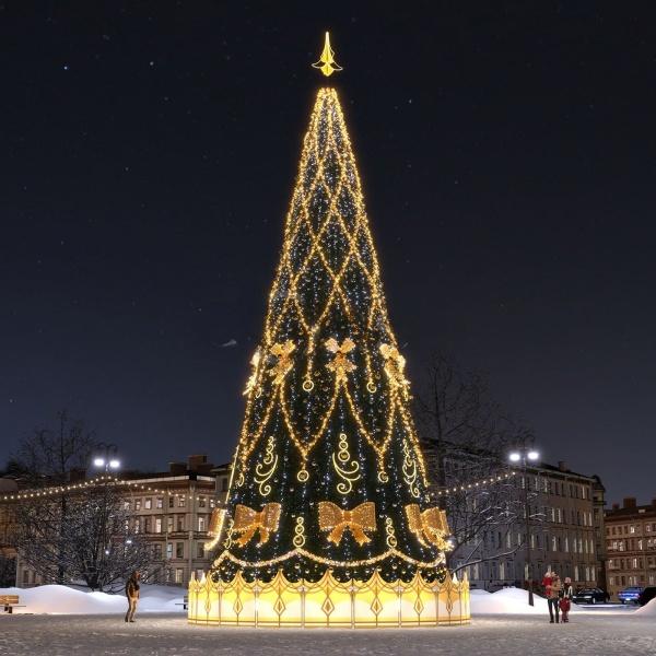 Если вы ищете ёлку, которая станет доминантой городского пространства или деловой площади, обратите внимание на уличную ель с оформлением «Золотые банты». Эта фигура высотой 22 или 24 метра рассчитана на масштабные территории: от центральных площадей до крупных парков и транспортных хабов. Она не просто украшает — она формирует настроение, собирает вокруг себя жителей и гостей, становится символом праздника.