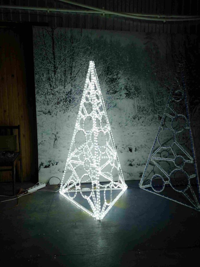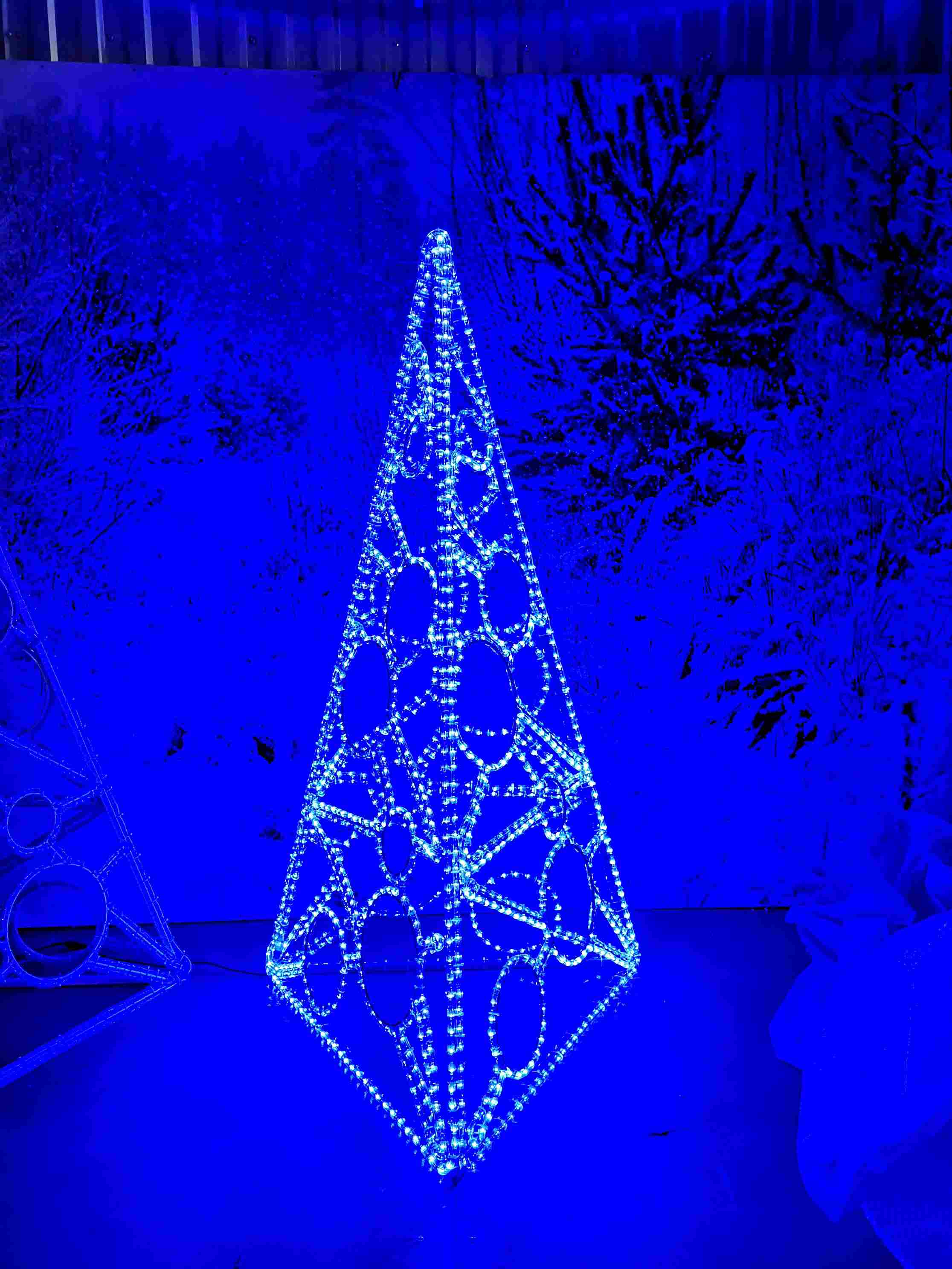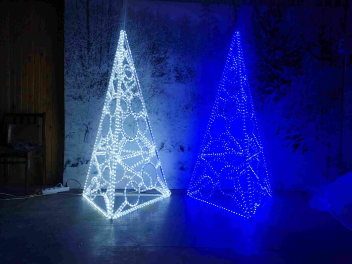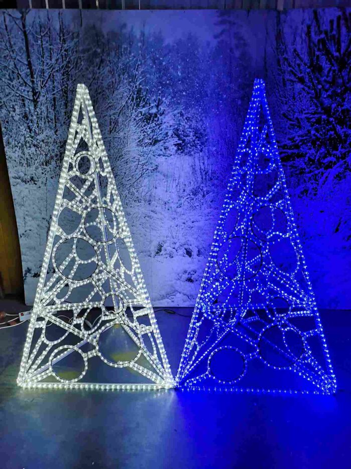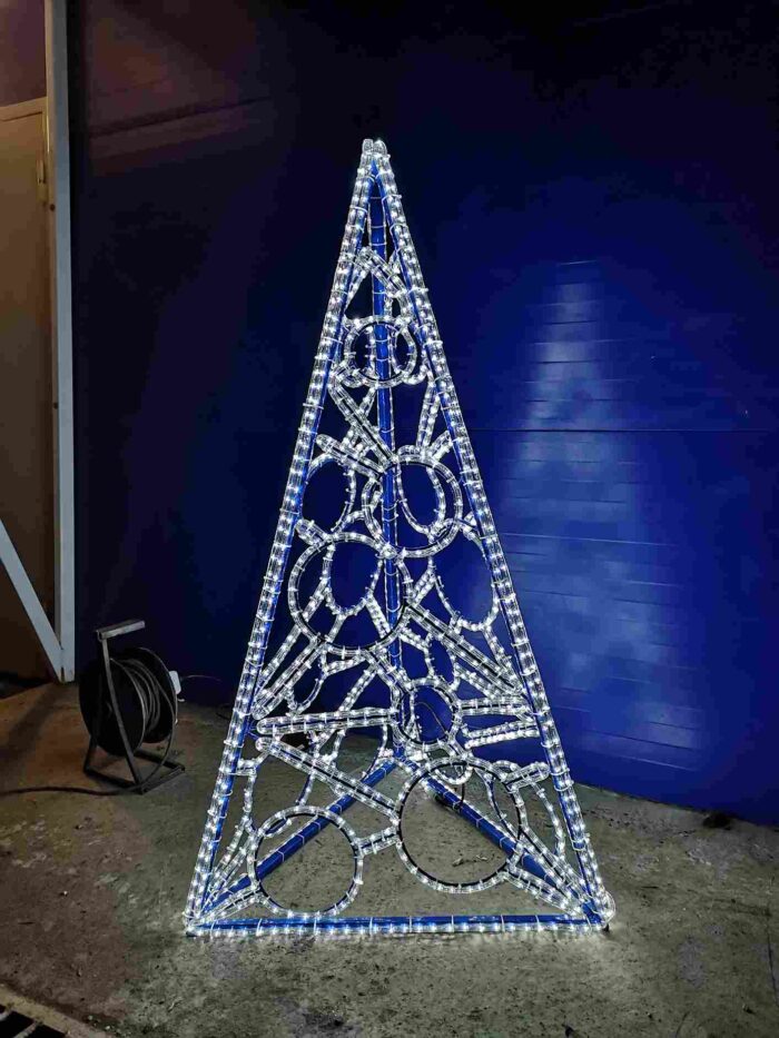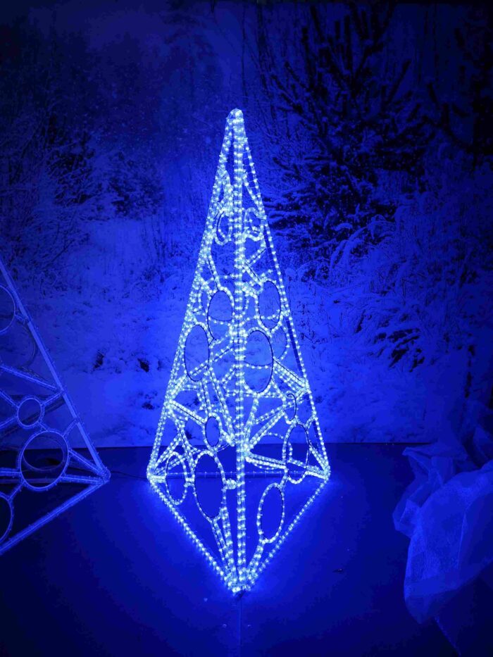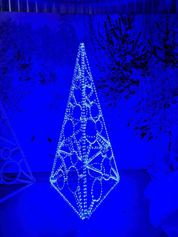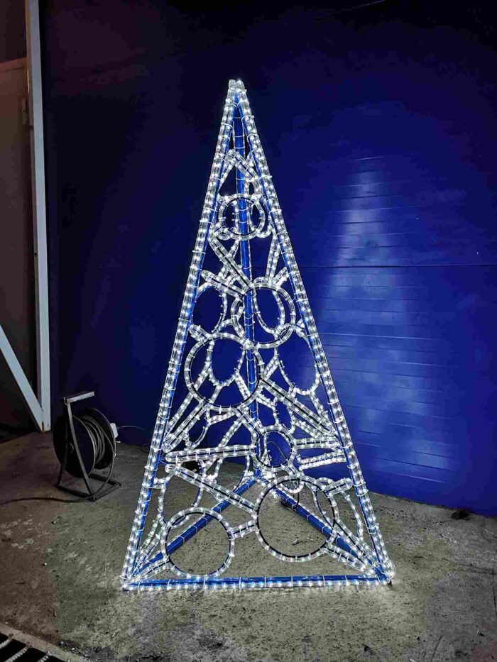 Ёлка трёхгранная 3D — это нестандартная световая фигура, которая привлекает внимание с любой стороны. За счёт оригинальной конструкции она выглядит выразительно как при фронтальном взгляде, так и в перспективе улицы. Объёмная форма, высокая точность сборки и возможность выбора цвета свечения делают эту модель универсальным решением для городских и коммерческих пространств.