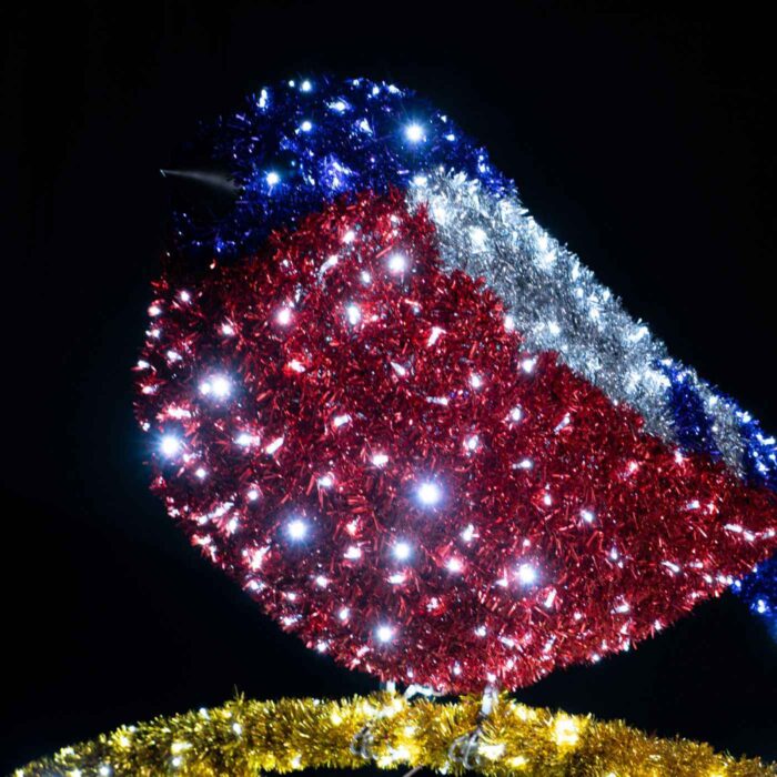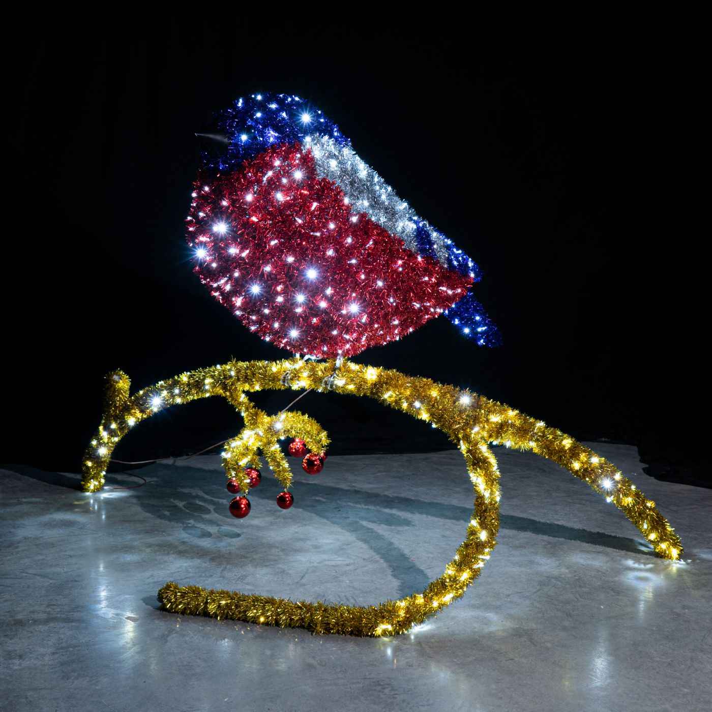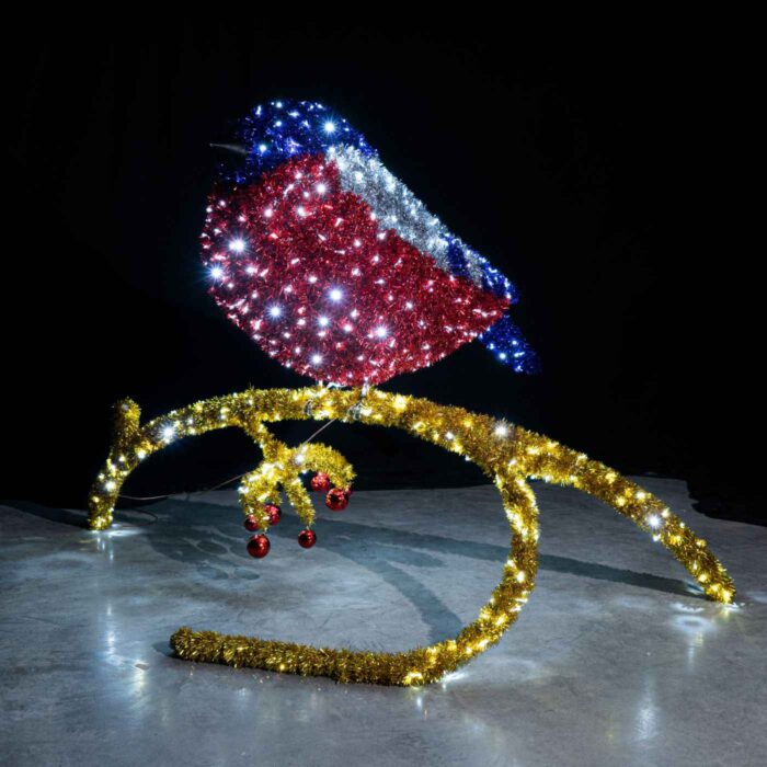 Уникальная мишурная фигура снегиря на ветке размером 3×2×1,3 метра с объёмным 3D-исполнением. Алюминиевый каркас серии OPTIMA-PRO обтянут специальной морозостойкой мишурой. Холодный белый свет подчёркивает текстуру мишуры и создаёт мягкое свечение. Символ русской зимы идеально подходит для новогоднего оформления. JOYLED создаёт эксклюзивные мишурные фигуры для создания уютной праздничной атмосферы с особой текстурой и объёмом.