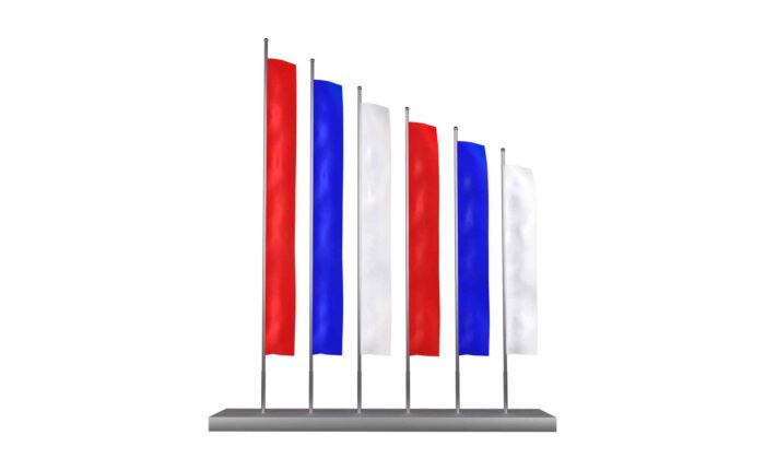 Масштабность. Высота 5 метров и шесть флагов делают конструкцию главным акцентом оформления.