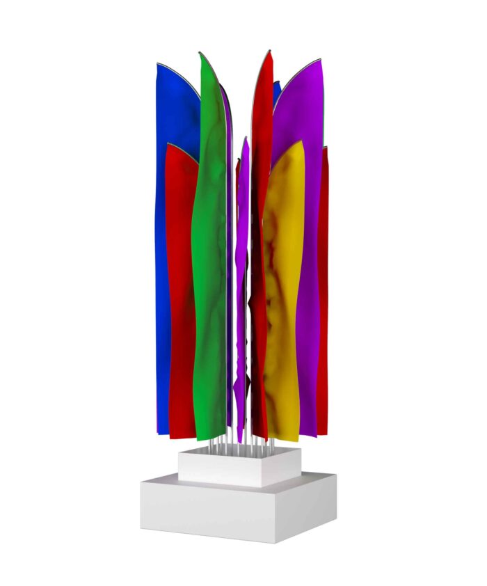 Фигура выполнена в плоском формате (2D), что облегчает транспортировку, хранение и монтаж. Благодаря продуманной геометрии и правильному углу разворота флагов, инсталляция смотрится объёмно даже без дополнительных элементов.