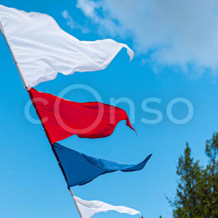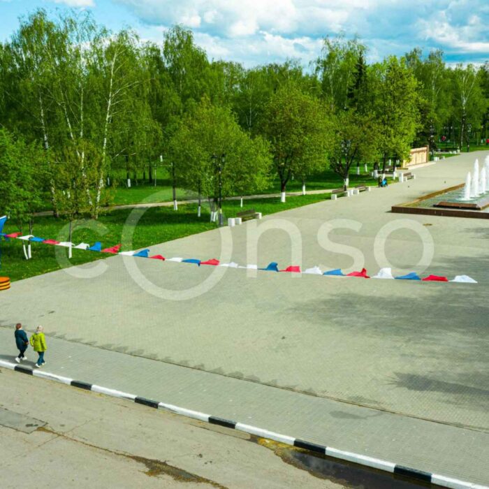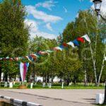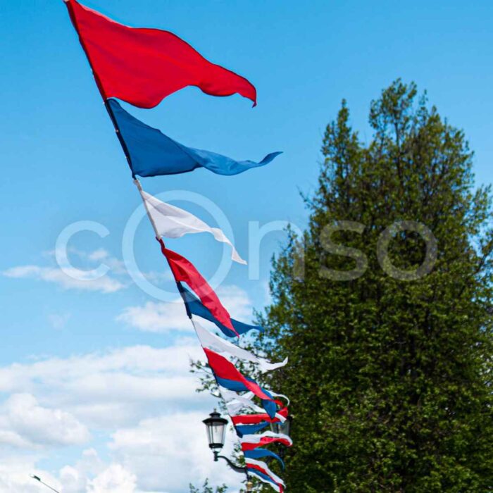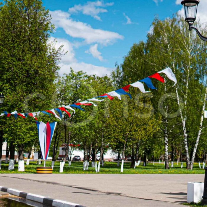 Флаговая перетяжка «Ф 001» — это световая конструкция, разработанная для уличного оформления в дни общественных и корпоративных праздников. Её главная особенность — протяжённая форма (8 метров), позволяющая использовать изделие как самостоятельный декоративный элемент, перекрывающий пространство между столбами, зданиями, входными арками и проездами.