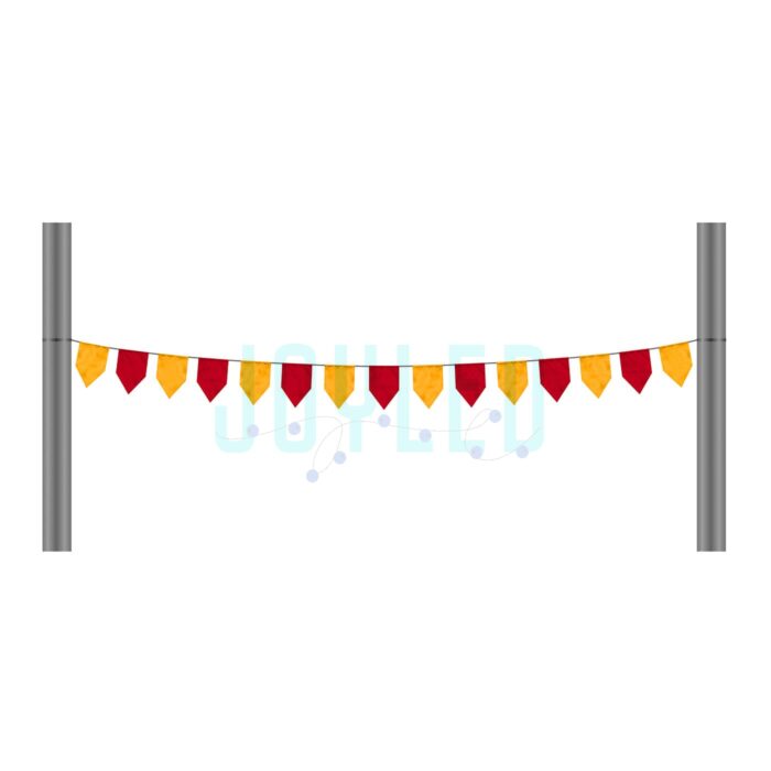 Световая флаговая перетяжка «Ф 002» предназначена для украшения городского пространства в дни праздников. Она органично вписывается в архитектуру улиц и площадей, создавая единый стиль оформления и усиливая праздничную атмосферу. Композиция выполнена в виде плоской 2D-перетяжки на тросе, что упрощает установку и позволяет использовать конструкцию многократно на разных участках.
