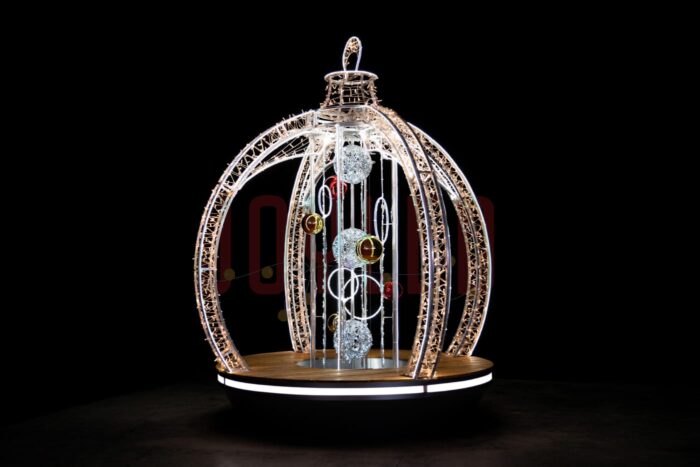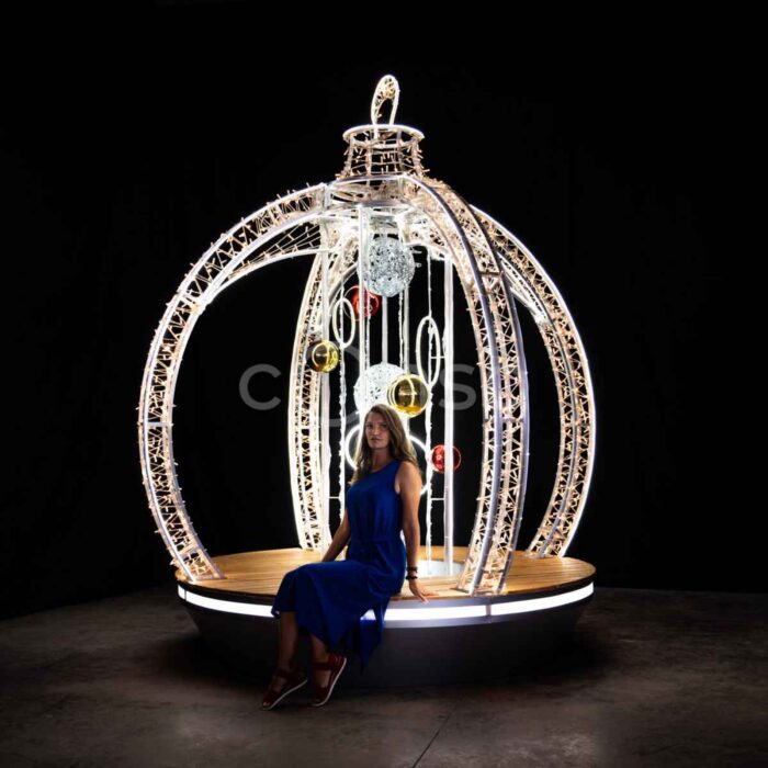 Фотозона «Шар с подвесками» — эффектная уличная фигура с тёплым свечением, выполненная из алюминия. Подходит для установки у ТЦ, на городской площади или в парке. Создаёт атмосферу праздника и становится популярным местом для фото. Конструкция устойчива, защищена по стандарту IP65 и выдерживает эксплуатацию при температуре до –50 °C.