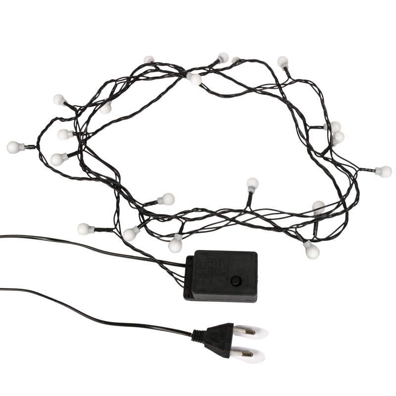 Эта 2,8-метровая светодиодная гирлянда «Цветные шарики» представляет собой зеленый провод из ПВХ с матовыми сферическими рассеивателями, излучающими свет различных оттенков. Всего гирлянда содержит 20 светодиодных элементов.