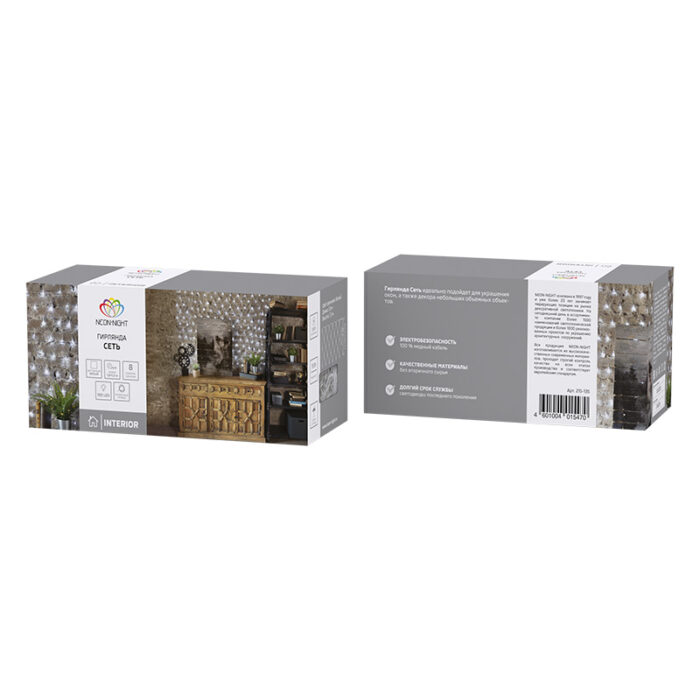 Светодиодная гирлянда "Сеть" размером 1,8×1,5 метра представляет собой декоративное полотно с ромбовидными ячейками, в узлах которых расположены 180 ярких светодиодов. Это украшение идеально подходит для эффектного оформления оконных проемов и легко крепится благодаря присоскам с крючками.