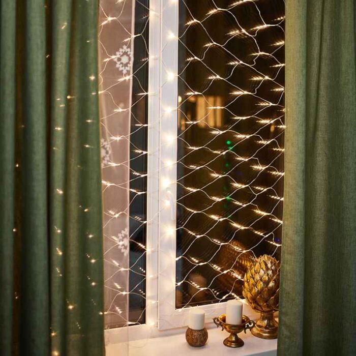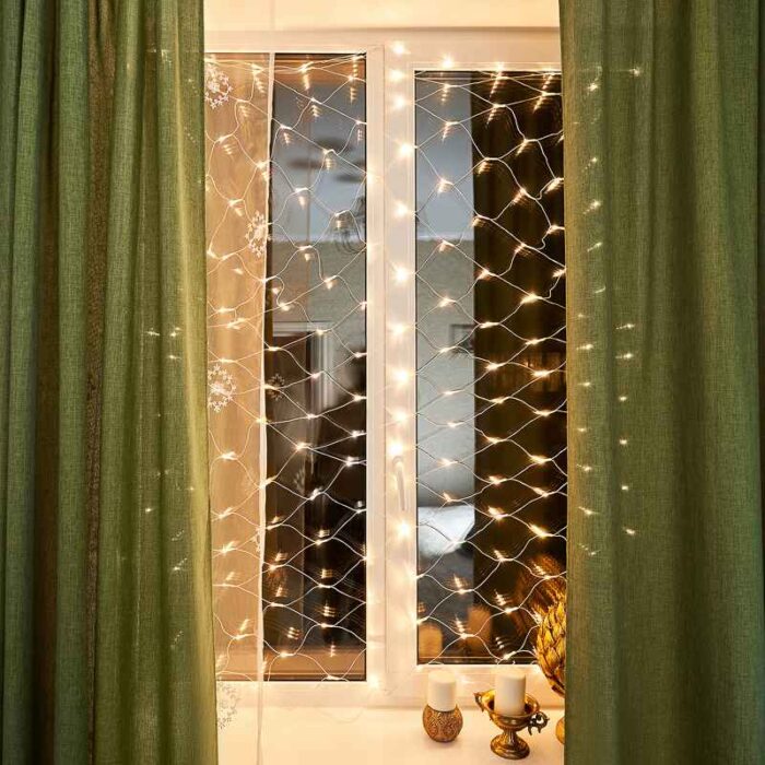 Светодиодная гирлянда «Сеть» размером 1,8×1,5 метра представляет собой декоративное полотно с ромбовидными ячейками, в узлах которых расположены 180 ярких светодиодов. Это украшение идеально подходит для эффектного оформления оконных проемов и легко крепится благодаря присоскам с крючками.