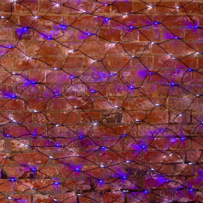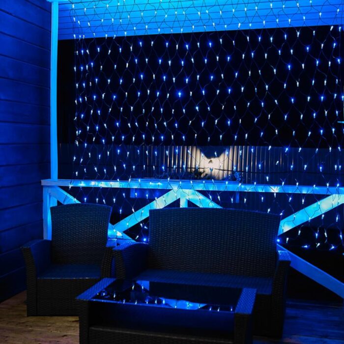 Светодиодная гирлянда в виде сети оформлена квадратами, разделенными на равные ромбы. В углах ромбов расположены светодиоды синего и белого цветов, чередующиеся вдоль линии. Благодаря своей необычной форме, гирлянда прекрасно подходит для украшения кустов, оборачивания колонн и столбов, а также для создания растяжек между опорами в беседках или на верандах. Часто её применяют для оформления окон и потолков.