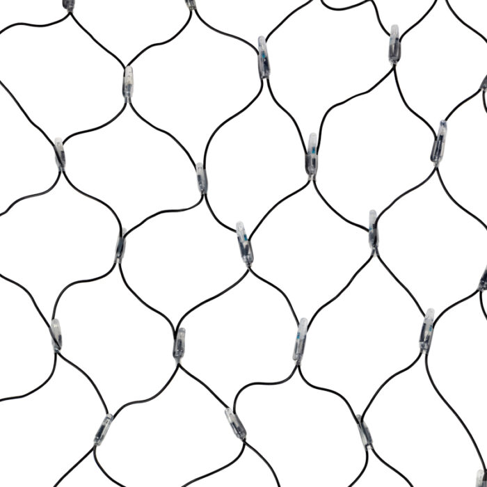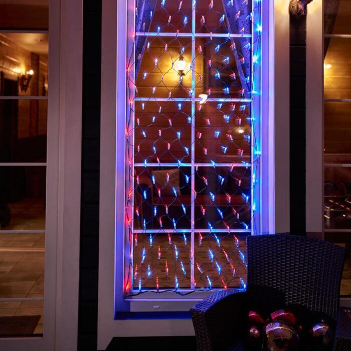 Светодиодная гирлянда в виде сети оформлена прямоугольниками, разделенными на равные ромбы. В углах ромбов расположены светодиоды, чередующиеся вдоль линии. Благодаря своей необычной форме, гирлянда прекрасно подходит для украшения кустов, оборачивания колонн и столбов, а также для создания растяжек между опорами в беседках или на верандах. Часто её применяют для оформления окон и потолков.