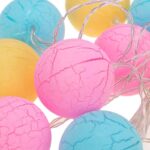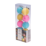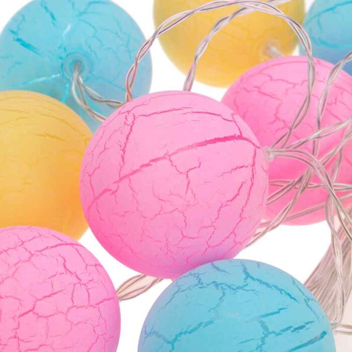 Гирлянда "Карамельки" представляет собой прозрачный ПВХ-провод, питаемый от батарейного блока, с десятью разноцветными пластиковыми шарами, в каждом из которых установлен мягко светящийся диод. Особая текстура поверхности шаров, имитирующая кракелюр, позволяет лучам света проходить сквозь материал, создавая волшебный эффект трехмерного сияния.