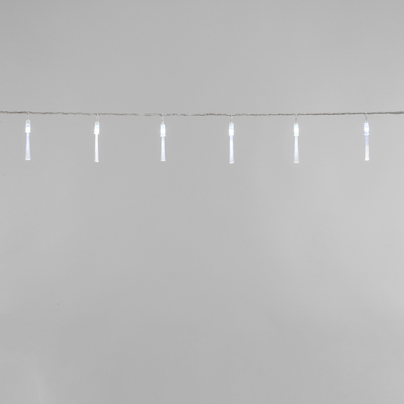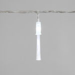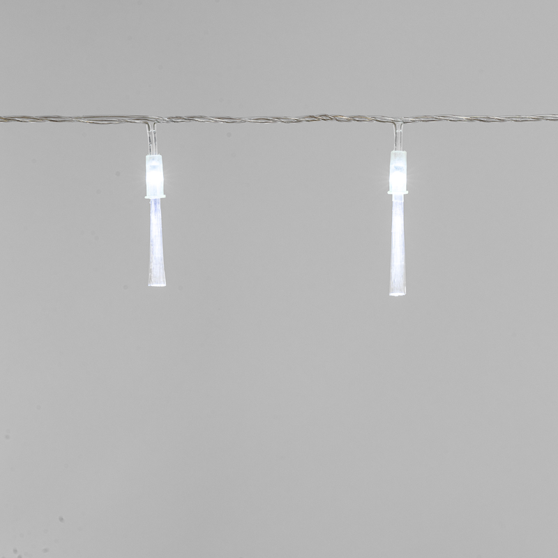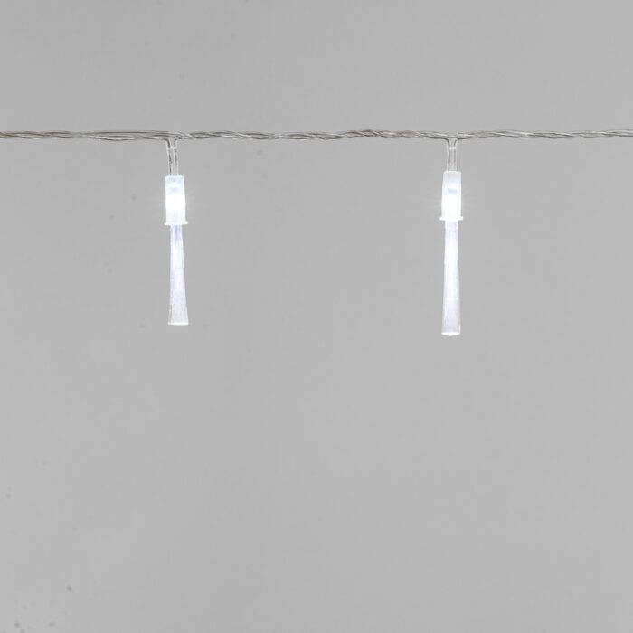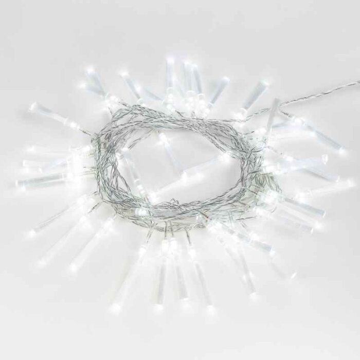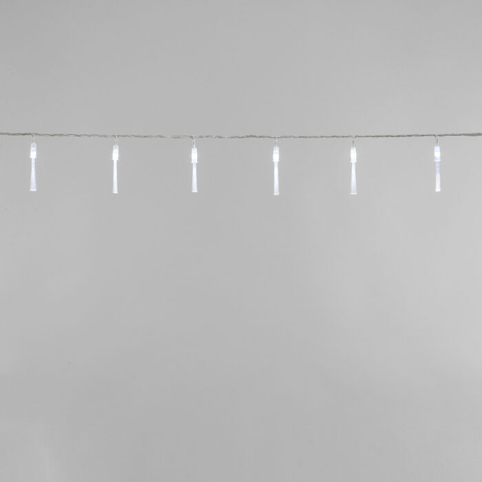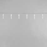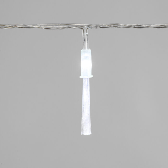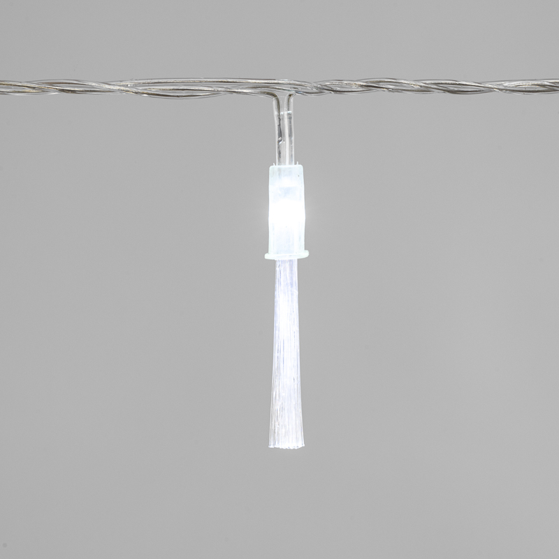 Пятиметровая светодиодная гирлянда «Кисточки» представляет собой серебристый провод, заключенный в прозрачную ПВХ-оболочку. По всей длине кабеля расположены светодиоды, излучающие нежное белое свечение.