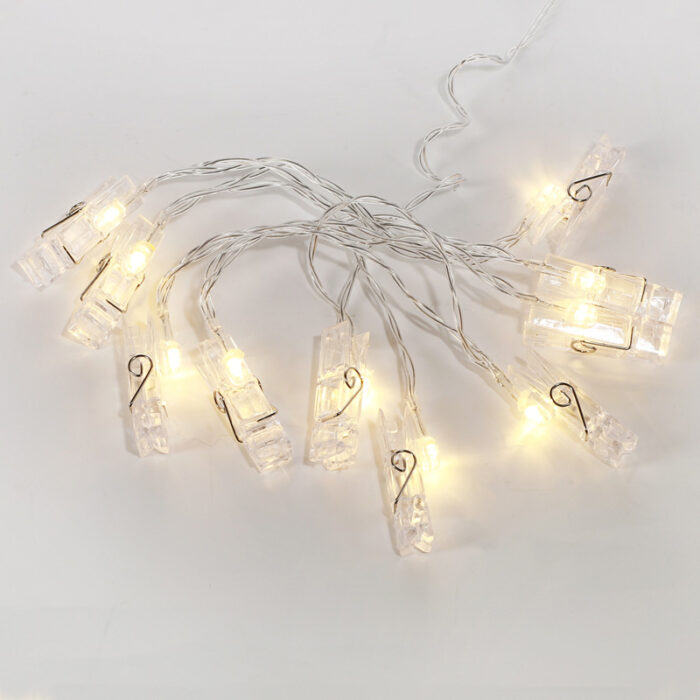 Гирлянда Прищепки 1.5м, Тепло-Белый с постоянным свечением, 3В, 10 LED, Провод Прозрачный ПВХ, IP20