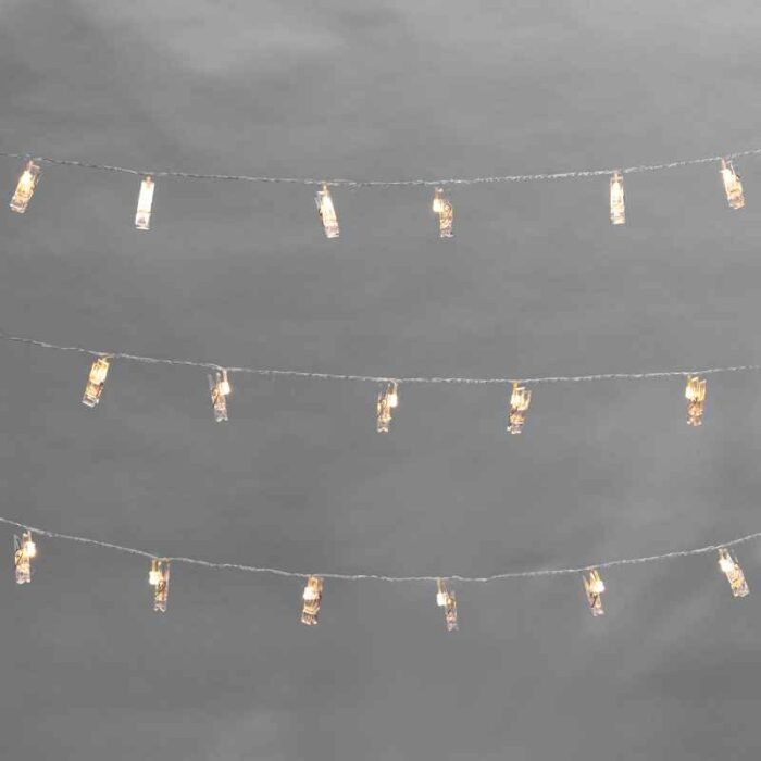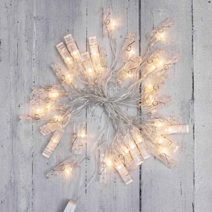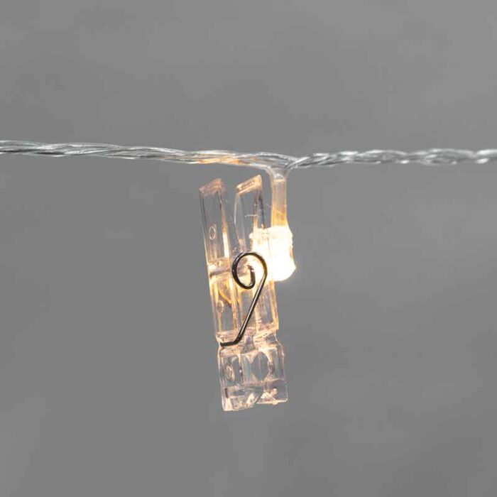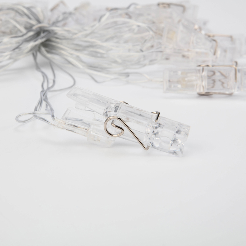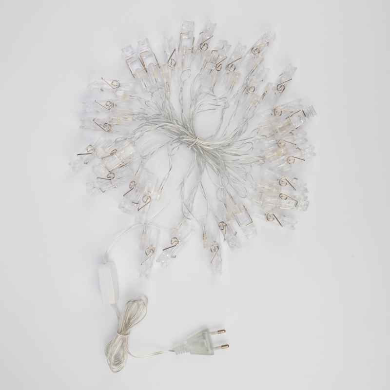 Гирлянда Прищепки 5м, Тепло-Белый с постоянным свечением, 230В, 30 LED, Провод Прозрачный ПВХ, IP20