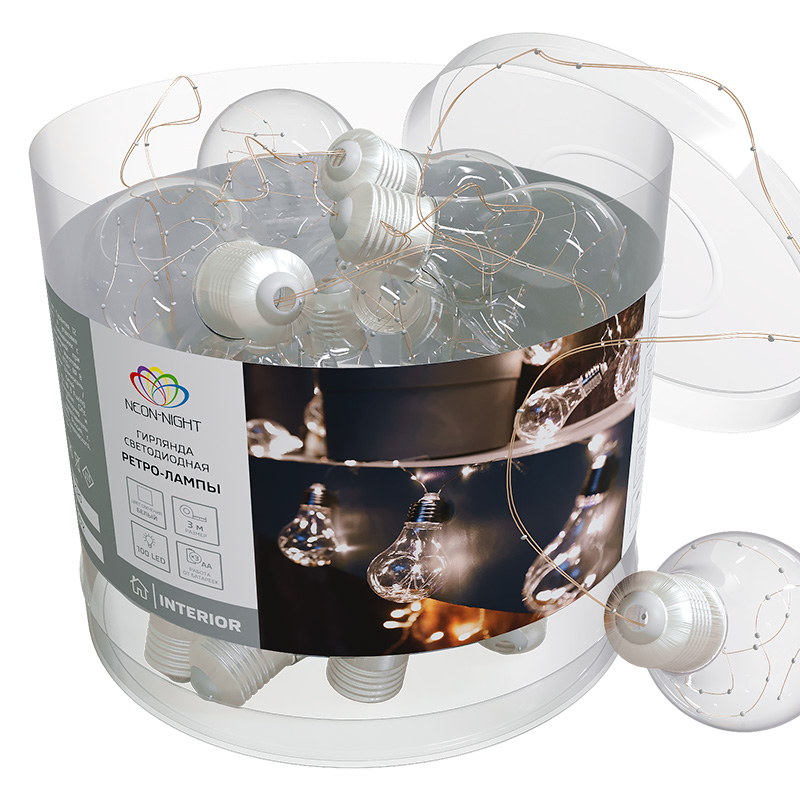 Ретро-гирлянда длиной 3 метра станет оригинальным и стильным акцентом в интерьере, украшая пространство не только в период новогодних торжеств, но и в обычные дни. Это гибкий провод, на котором размещены 100 светодиодов, излучающих мягкое свечение. На проводе также закреплены 10 декоративных насадок, имитирующих старинные лампы накаливания с серебристыми основаниями, которые эффектно подсвечиваются светодиодами изнутри. Важным преимуществом гирлянды является ее автономность: она работает от 3 батареек типа АА, что обеспечивает полную безопасность и удобство использования.